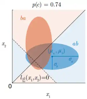 The optimal strategy in a 2AFC task for univariate normal stimuli from categories and is to classify between the two joint bivariate normal distributions and .[19] The probability of the correct choice is 0.74 here.