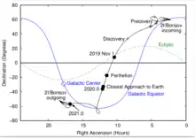 As seen from Earth, the comet was in the northern sky from September until mid-November. It crossed the ecliptic plane on 26 October near the star Regulus,[40] and the celestial equator on 13 November 2019, entering the southern sky. On 8 December 2019, the comet reached perihelion (closest approach to the Sun)[3] and was near the inner edge of the asteroid belt. In late December, it made its closest approach to Earth,[11][14] 1.9 au, and had a solar elongation of about 80°.[5] Due to its 44° orbital inclination, 2I/Borisov did not make any notable close approaches to the planets.[3] 2I/Borisov entered the Solar System from the direction of Cassiopeia near the border with Perseus. This direction indicates that it originates from the galactic plane, rather than from the galactic halo.[39][41] It will leave the Solar System in the direction of Telescopium.[39][41] In interstellar space, 2I/Borisov takes roughly 9000 years to travel a light-year relative to the Sun.[lower-alpha 5]