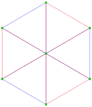 The regular complex polygon 2{4}3 has 6 vertices in with a real representation in matching the same vertex arrangement of the 3-3 duopyramid. It has 9 2-edges corresponding to the connecting edges of the 3-3 duopyramid, while the 6 edges connecting the two triangles are not included. It can be seen in a hexagonal projection with 3 sets of colored edges. This arrangement of vertices and edges makes a complete bipartite graph with each vertex from one triangle is connected to every vertex on the other. It is also called a Thomsen graph or 4-cage.[3]