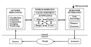 Sensory processing performs the functions of windowing, grouping, computation, estimation, and classification on input from sensors. World modeling maintains knowledge in the form of images, maps, entities, and events with states, attributes, and values. Relationships between images, maps, entities, and events are defined by pointers. These relationships include class membership, ontologies, situations, and inheritance. Value judgment provides criteria for decision making. Behavior generation is responsible for planning and execution of behaviors.[5]