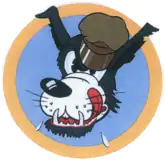 - ↑ Approved 3 May 1945. Description: Over and through a medium blue disc, border golden orange, a caricatured gray wolf's head, trimmed black, mouth and tongue red, wearing an olive drab service cap tilted over the left eye. Maurer reverses the approval dates for the 865th and 866th Bombardment Squadrons.