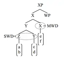 Tseng suggests that A-not-A occurs post-syntactically, at the morphological level. It is movement that occurs overtly at the phonetic form, after the syntactic movement has occurred. A-not-A is a feature of T that operates on the closest, c-commanded MWd, and not subwords (SWd). The elements that undergo post-syntactic movement are MWds. A node X is a MWd iff X is the highest segment and X is not contained in another X. A node X is a SWd if X is a terminal node and not an MWd.[13] The A-not-A operation is a MWd to MWd movement.