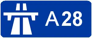 Autoroute 28 is a French mainland motorway linking Abbeville in the Somme to Tours in Indre-et-Loire. The motorway starts at Abbeville, splitting from the A16 and, after merging with the A13 near Rouen, ends at Tours, merging with the A10. It is 405 km long. The motorway between Rouen and Tours was added to the Schéma Directeur Routier National in 1987.