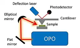 AFM-IR (atomic force microscope-infrared spectroscopy) or infrared nanospectroscopy is one of a family of techniques[1][2][3][4][5][6][7][8][9][10][11][12][13][14][15] that are derived from a combination of two parent instrumental techniques. AFM-IR combines the chemical analysis power of infrared spectroscopy and the high-spatial resolution of scanning probe microscopy (SPM). The term was first used to denote a method that combined a tuneable free electron laser with an atomic force microscope (AFM, a type of SPM) equipped with a sharp probe that measured the local absorption of infrared light by a sample with nanoscale spatial resolution.[16][17][18]