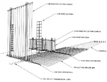 The 1970 estimate to construct a CDAA was just under $900,000 ($6.78 million today) with electronics at the site estimated at $20 million ($151 million today).[1] The system had 120 high band antennas and 40 low band antennas which had to be positioned within +/- two minutes of arc and +/- 3 inches of their intended distance from the center of the array. 160 75 ohm coaxial transmission lines were used to carry signals from the antennas had to be electrically matched to within 3/4 of a degree at 10 MHz. This task was estimated at 300 to 400 man hours to complete.[1] There was also an extensive grounding system used at the FRD-10 sites. This included 360 ground radials made of 8 AWG wire, 150 feet (46 m) long, extending from the outer antenna ring. It also included a massive ground grid, made of 10 AWG wire bonded together to create a mesh with 2 feet (61 cm) squares. It was laid underground up to the radials in the area between the high and low antennas.[1]