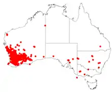 Widely distributed throughout the Southwest of Australia and recorded into the Eremaean province.[3] The explorer Henry Lefroy found the species was very common between Narembeen and the Avon River and growing with sandalwood (Santalum acuminatum) in 1863, the conservator of forests, John Ednie Brown, estimated in 1895 that an area of four million acres was dominated by this species growing with Eucalyptus loxophleba (York gum), the valuable sandalwood having already been cleared. Drummond noticed the species growing outside its range at Guildford, attributing this occurrence to spilled seed that had been transported to the site in food bags. The first thorough survey of the distribution was documented by Surveyor General Malcolm Fraser in 1882, who recorded a range from Champion Bay to the south at Gordon River; he also notes the consumption of its seed and regrowth by introduced stock animals.[1]