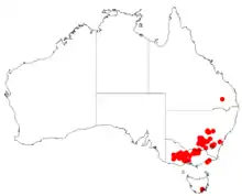 The species occurs in ranges from the Grampians eastward to the Warby Ranges in Victoria and from Yass northward to Peak Hill in New South Wales. It is found on sandy or gravelly soils in open forest or mallee communities.[3]