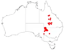 Acacia cana is found in New South Wales western plains e.g near white cliffs, The Sturt National Park and Merindee. It is also found as far north as central Queensland at Avadale.[1][4][6][7] These areas are woodlands that can be widely scattered that are made up of sandy soils and gibber plains (desert pavement).[7][9] This acacia species grows in this type of habitat as it can associate with mugla species (different acacia family), leopardwood (Flindersia maculosa) and belah (Casuarina cristata).