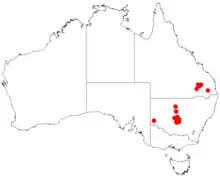 It has a disjunct distribution and is endemic to parts of south eastern Queensland in the Darling Downs are around Gurulmundi growing in poorly drained sandy soils overlying sandstone in the north and also is found on the western plains of New South Wales where it is found on igneous hill growing in skeletal soils.[3] In New South Wales it is found around Lake Cargelligo and the Gunderbooka Range. The three areas it is found in are separated by several hundred kilometres. Within these areas there are approximately twenty populations of the species found in around from ten broad localities continuing a total of fewer than 5,000 individual plants.