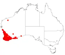 It is found in the Perth, Peel, South West, Great Southern and southern parts of the Wheatbelt and Mid West where it is commonly situated in swamps, low-lying areas and near creeks and rivers.[2] The range of the plant extends from around Geraldton in the north down to near Esperance in the east and to coastal areas in the west and south. Geraldton to Esperance. A single population has also been recorded in South Australia in Creek Conservation Park.[3]