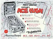 Ace High is a woodrail pinball machine released by Gottlieb in 1957. It features a card gambling theme.[1] It should not be confused with Aces High by Bally.[2]