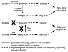 By taking advantage of the pathways which use acetyl-CoA as a substrate, engineered products can be obtained which have potential to be consumer products. By overexpressing the acs gene, and using acetate as a feedstock, the production of fatty acids (FAs) may be increased.[15] The use of acetate as a feed stock is uncommon, as acetate is a normal waste product of E. coli metabolism and is toxic at high levels to the organism. By adapting the E. coli to use acetate as a feedstock, these microbes were able to survive and produce their engineered products. These fatty acids could then be used as a biofuel after being separated from the media, requiring further processing (transesterification) to yield usable biodiesel fuel. Original adaptation protocol for inducing high levels of acetate uptake was innovated in 1959 as a means to induce starvation mechanisms in E. coli.[16]