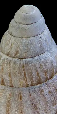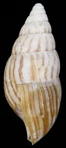 The somewhat thin and fragile shell is small compared to what is known from the other achatinids in southern Africa, its length/height is less than 45 mm with about 7½ whorls. (This description is in contradiction to Connolly (1925),[3] who probably attributes a wrongly identified shell 63.2 mm long to this taxon – a statement not repeated in his 1939 monograph.[2]) The length is always more than two times the maximum diameter, which is situated at about the level of the apex of the aperture.[2] The length of the aperture is always less than half that of the shell; the length of the last whorl in front view is always under three quarters of the total length. The apex is comparatively blunt. The whorls are hardly convex, including the body whorl.[2] The aperture is fairly narrow (greatest width just under the middle) with a thin outer lip; the columella is white, short and narrow, concave with a slight twist, obliquely truncate close to the base. The nepionic whorls are wrinkled and granulose, though always worn in the material studied.[2] The sculpture consists of regular and close wrinkles resulting in a reticulate-granulate pattern, very prominent below the sutures but well visible on all whorls; in addition there are very faint growth striae.[2] All specimens exhibit a close and fine zebra pattern with irregular, orange-brown flames on a yellowish-brown background; there is a very thin and deciduous periostracum.[2] On the whole this seems to be a well-defined taxon because of the size, shape and sculpture of the shell.[2]