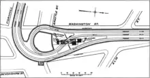 Scollay Square and Adams Square had similar baroque granite headhouses with four-sided clock towers designed by Charles Brigham. A small exit structure was located to the north, while the Brattle Loop used a separate entrance built into a building at Court Street and Brattle Street.[3] The headhouses of the Tremont Street subway were sharply criticized as "pretentiously monumental", with the Scollay Square headhouse compared to "an enlarged soda fountain".[4][5] Later stations on the East Boston Tunnel and Washington Street tunnel incorporated this criticism into their more modest headhouses.[4] In 1931, the headhouse was removed to improve visibility for automobile drivers and was replaced by a significantly smaller structure of modern design.[6][7] (Large headhouses at Scollay Square and Harvard were also torn down for similar reasons in that era.)[8]:32[9]