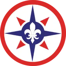 The coat of arms appears on the breast of a displayed eagle on the regimental flag. The coat of arms is: Azure (dark blue) within a bordure per bordure Argent and Gules, an inescutcheon paly of thirteen Argent and Gules; on a chief Azure a mullet Argent between a pattern of twelve of the like (as on The Adjutant General's Corps insignia of branch), all within a bordure Argent and enclosed in base by two laurel leaves Or. Displayed above the eagle's head is the crest (On a wreath of the colors Argent and Azure the numerals "1775" Gules.)