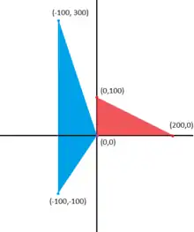 Transforming the three corner points of the original triangle (in red) gives three new points which form the new triangle (in blue). This transformation skews and translates the original triangle.