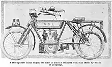 On 7 January 1901 the British engineer Archibald Sharp patented a method for making a seal allowing pneumatic or hydraulic apparatus described as a "rolling mitten seal",[1] and on 11 January 1901 he applied for a patent for the use of the device to provide air suspension on bicycles.[2] Further developments using this 1901 seal followed.[3][4] A company called Air Springs Ltd started producing the A.S.L. motorcycle in 1909.[5] This was unusual in having pneumatic suspension at front and rear - rear suspension being unusual in any form of motorcycle at that time. The suspension units were similar to the normal girder forks with the spring replaced by a telescopic air unit which could be pressurised to suit the rider. Production of the motorcycles ceased in 1914.