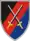 The coat of arms of Airmobile Operations Division depicts a flying black eagle, with its wings turned upright, holding a sword in its claws on a argent. Below the eagle a red arrow is shown. The argent symbolises dedication and the eagle strength, courage and bravery. The eagle's upturned wings, somewhat unusual in heraldry, represent the lunging out for new power. The sword stands for strike capability and penetration depth. The red arrow illustrates the third dimension, the depth of space and the dynamics of the division. The framing silver cord shows the status as a division. The maroon coloured seam corresponds with the traditional beret colour of the Army Aviation Corps and airborne forces.