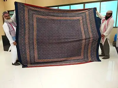 Ajrak (Sindhi: اجرڪ), also known as Ajrakh, is a unique form of textile block-printing found mostly in Sindh, Pakistan[1] and Ajrakhpur, Kutch district, India.[2] Ajrak textiles like shawls or dresses display special designs and patterns made using block printing with stamps. Ajrak is a symbol of Sindhi culture and traditions.[3] Ajrak prints are also famous in neighbouring areas of India, in Gujarat, due to their influence from the Indus Valley civilization.[4] Apart from Sindh and Kutch, recently, a Saraiki version of the Ajrak called Sajarak was created and is found in South Punjab, Pakistan.