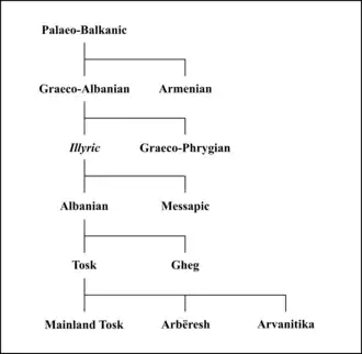 There are two principal dialects of the Albanian language traditionally represented by Gheg and Tosk.[115][116] The ethnogeographical dividing line is traditionally considered to be the Shkumbin river, with Gheg spoken in the north of it and Tosk in the south. Dialects of linguistic minorities spoken in Croatia (Arbanasi and Istrian), Kosovo, Montenegro and northwestern North Macedonia are classified as Gheg, while those spoken in Greece, southwestern North Macedonia and Italy as Tosk.