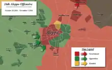 The Aleppo offensive of October–November 2016, named the "Battle of the Hero Martyr Abu Omar Saraqib" by the Army of Conquest,[6] refers to a military operation launched on the western outskirts of Aleppo at the end of October 2016 by rebel forces in Syria, against the Syrian government forces and its allies. The aim of the offensive was to establish a new supply line into Aleppo city, after an Army-initiated summer campaign had cut off all rebel access to Aleppo.