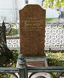 Aged seventy upon his retirement, he lived in his shared apartment with his sickly wife and another couple. He died in Moscow from congestive heart failure, and was given an honourable state funeral, buried in the Novodevichy Convent, by representatives from the 'new Russia' (the Bolsheviks), and the 'old Russia' (the clergy, the middle and upper class). His second wife Nadezhda Brusilova-Zhelikhova (1864–1938) is buried in the Orthodox section of the Olšany Cemetery in Prague, along with a number of other members of the Russian emigration.