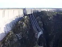 The dam supplies the Villarino Power Station with water via a tunnel for hydroelectric power generation. It is located underground about 14 km (8.7 mi) west of the dam. Water discharged from the power station enters the Douro River. The power station has an installed capacity of 810 MW and was completed in 1977.[2]