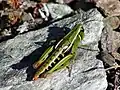 Alpinacris tumidicauda is a species of grasshopper only known from Otago and Southland, New Zealand. The genus Alpinacris is endemic to the South Island of New Zealand. A. tumidicauda was described in 1967 by Robert Sidney Bigelow,[1] with a type locality of Obelisk (Māori: Kopuwai) in the Old Man Range (45°19′22″S 169°12′27″E / 45.3228°S 169.2074°E). A male holotype and paratype are deposited in the Canterbury Museum, Christchurch. Like all of New Zealand sub-alpine and alpine grasshoppers, A. tumidicauda has a 2- or 3-year life cycle. The eggs must "overwinter" before they will hatch. Hoppers are found throughout the year, and adult grasshoppers can be found throughout the New Zealand summer between December and April. The adult A. tumidicauda do not overwinter.