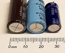 - ↑ Rubycon, Cautions for Proper Use of Aluminum Electrolytic Capacitor PDF Archived 2016-03-04 at the Wayback Machine