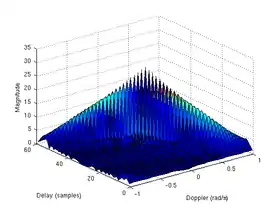 In pulsed radar and sonar signal processing, an ambiguity function is a two-dimensional function of propagation delay and Doppler frequency , . It represents the distortion of a returned pulse due to the receiver matched filter[1] (commonly, but not exclusively, used in pulse compression radar) of the return from a moving target. The ambiguity function is defined by the properties of the pulse and of the filter, and not any particular target scenario.