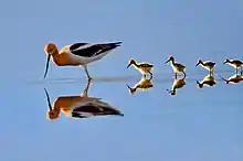 The American avocet (Recurvirostra americana) is a large wader in the avocet and stilt family, Recurvirostridae, found in North America. It spends much of its time foraging in shallow water or on mud flats, often sweeping its bill from side to side in water as it seeks crustacean and insect prey.