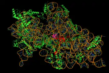 The inhibition of protein synthesis is mediated through aminoglycosides' energy-dependent, sometimes irreversible binding, to the cytosolic, membrane-associated bacterial ribosome (image at right).[2] (Aminoglycosides first cross bacterial cell walls—lipopolysaccharide in gram-negative bacteria—and cell membranes, where they are actively transported.[8]) While specific steps in protein synthesis affected may vary somewhat between specific aminoglycoside agents, as can their affinity and degree of binding,[8] aminoglycoside presence in the cytosol generally disturbs peptide elongation at the 30S ribosomal subunit, giving rise to inaccurate mRNA translation and therefore biosynthesis of proteins that are truncated, or bear altered amino acid compositions at particular points.[2] Specifically, binding impairs translational proofreading leading to misreading of the RNA message, premature termination, or both, and so to inaccuracy of the translated protein product. The subset of aberrant proteins that are incorporated into the bacterial cell membrane may then lead to changes in its permeability and then to "further stimulation of aminoglycoside transport".[2] The amino sugar portion of this class of molecules (e.g., the 2-deoxystreptamine in kanamycins, gentamicins, and tobramycin, see above) are implicated in the association of the small molecule with ribosomal structures that lead to the infidelities in translation (ibid.). Inhibition of ribosomal translocation—i.e., movement of the peptidyl-tRNA from the A- to the P-site—has also been suggested. Recent single-molecule tracking experiments in live E. coli showed an ongoing but slower protein synthesis upon treatment with different aminoglycoside drugs.[9] (Spectinomycin, a related but distinct chemical structure class often discussed with aminoglycosides, does not induce mRNA misreading and is generally not bactericidal.)[8]
