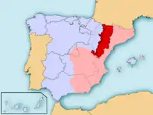 Map of the territory administered by the Regional Defence Council of Aragon (in red) within Republican Spain (in pink), during the Spanish Revolution