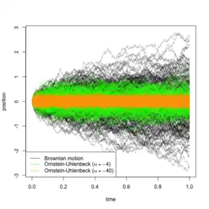 - Ornstein-Uhlenbeck process: in brief, an Ornstein-Uhlenbeck process is a continuous stochastic process that behaves like a Brownian motion, but attracted toward some central value, where the strength of the attraction increases with the distance from that value.[54][55][56] This is useful for modelling scenarios where the trait is subject to stabilizing selection around a certain value (say ). Under this model, the above-described transition of being in state to being in state would have a likelihood defined by the transition density of an Ornstein-Uhlenbeck process with two parameters: , which describes the variance of the driving Brownian motion, and , which describes the strength of its attraction to . As tends to , the process is less and less constrained by its attraction to and the process becomes a Brownian motion. Because of this, the models may be nested, and log-likelihood ratio tests discerning which of the two models is appropriate may be carried out.[53]