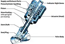 The valve is equipped with a pneumatic actuator supplied by a three-way solenoid valve. The pressure of the pilot medium enters the actuator cylinder and acts on the piston, which allows the seal to open or to close through the stem. The return of the seal into its rest position is usually achieved by a return spring that can be found in the pneumatic actuator.