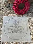 On 25–26 September 1915 during operations on Hill 70 at the Battle of Loos, France, Lieutenant-Colonel Douglas-Hamilton, when the battalions on his right and left had retired, rallied his own battalion again and again and led his men forward four times. The last time he led all that remained, about 50 men, in a most gallant manner, and was killed at their head. It was due to his bravery, and splendid leadership that the line at this point was able to check the enemy's advance.[1][2]