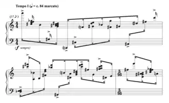 As a part of his interest in modernistic music, each movement of the Phoenix Mass centres on a particular interval,[3] such as whole tones in the Gloria and major thirds in the Sanctus.[2] Paraphrases and Cadenzas (1969) also utilises specific intervallic designations for each movement, each of which align with a movement of the Mass.[28] Another interest of Payne's was numerology; the virtuosic Paean (1971) is built on a series of sequences based on a random number table: 7 3 4 1 1 2 5 2 1 9 5 5 7 8 4 2 3 3 4 9 9 6.[27] The Stones and Lonely Places Sing (1979) uses numerology of a different fashion; the proportions of 3 2 7 4 1 6 5 decide the phrase length, resulting in phrases of 21 bars (3x7), 14 bars (2x7), 49 bars (7x), 28 bars (7x4), 7 bars (7x1), 42 bars (7x6) and 35 bars (7x5).[2] Other musical trademarks include wide spaced harmonies and frequent alternation between strict and fluid rhythmic frameworks.[8]