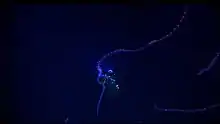 In the ocean, the aphotic zone is sometimes referred to as the dark ocean. Depending on how it is defined, the aphotic zone of the ocean begins between depths of about 200 m (660 ft) to 800 m (2,600 ft) and extends to the ocean floor.[1][2][3] The majority of the ocean is aphotic, with the average depth of the sea being 4,267 m (13,999 ft) deep with the deepest part of the sea, being the Challenger Deep in the Mariana Trench, is about 11,000 m (36,000 ft) deep. The depth at which the aphotic zone begins in the ocean depends on many factors. In clear, tropical water sunlight can penetrate deeper and so the aphotic zone starts at greater depths. Around the poles, the angle of the sunlight means it does not penetrate as deeply so the aphotic zone is shallower. If the water is turbid, suspended material can block light from penetrating, resulting in a shallower aphotic zone.[4] Temperatures can range from roughly 0 °C (32 °F) to 6 °C (43 °F).