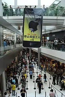 SACOM protests in 2013 at the opening of the first Apple Store in Hong Kong over labor rights violations in its supplier factories Foxconn and Wintek.[1]