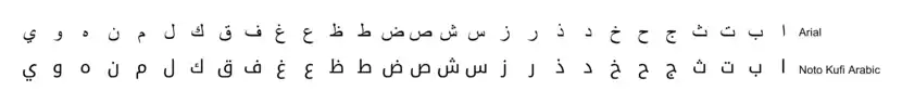 Some fonts use more right angles, for example Noto Kufi Arabic. Others, like Tahoma and Arial, have a more rounded style (see graph below). A font with tendency towards right angles is also called 'angled',[4] and rounded fonts are also called 'cursive'.[5]