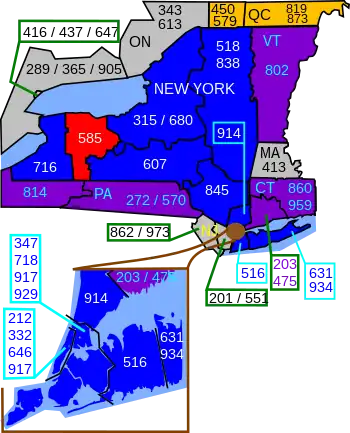 Area code 585 is the telephone area code in the North American Numbering Plan for the city of Rochester and eight surrounding counties in Western New York state. The area code was activated on November 15, 2001, when the numbering plan area of area code 716 was reduced in geographic reach in an area code split. Previously, Rochester had shared 716 with Buffalo.[1] Aside from new area codes created in the New York City metropolitan area and Long Island, 585 was the second new area code in the state since 1954, having been preceded by 845 in 2000.