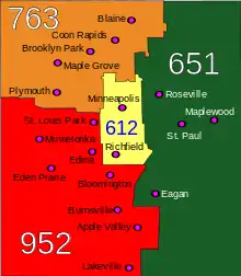 The area code splits in the Twin Cities are unusual because they split along municipal, rather than exchange area boundaries. This led to a division of numerous exchange areas between the two area codes, and a few being divided among three.[2]