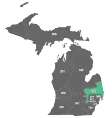 Area code 810 was split off from area code 313 on December 1, 1993, with a permissive dialing period that ended on August 10, 1994.[1] The initial numbering plan area included the counties of Oakland, Macomb, Genesee, Lapeer, St. Clair, and Sanilac as well as small sections of Saginaw, Shiawassee, Livingston, Washtenaw, and Wayne counties north of Detroit. Most of Washtenaw County, all of Monroe County, and the southern and western portions of Wayne County (including the City of Detroit) remained in the 313 area code. The split created Michigan's first new area code since 1961.