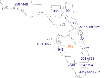 Numbering plan area (NPA) 863 used to be part of NPA 305, which was originally the entire state of Florida. In 1953, the southwest Florida coast was split off with area code 813, while all of north Florida was split off with area code 904 in 1965. The southeast portion retained 305. Area code 813 was unmodified for 43 years until 1996, when the 13 counties outside of the immediate Tampa Bay area (all but Hillsborough, Pinellas, and Pasco counties) were assigned area code 941. In 1999, numbering plan area 863 took its current form as the coastal counties kept 941, while the rest received area code 863.