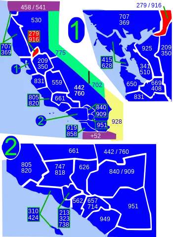 Area codes 916 and 279 are California telephone area codes that serve Sacramento, the state capital, and most of its suburbs. Area code 916 was one of the first three original area codes established in California in October 1947. It originally covered most of Northern California, but area code splits have reduced its coverage to the greater Sacramento area. Area code 279 began service in March 2018 to relieve an exhausted supply of telephone numbers in the 916 area code.