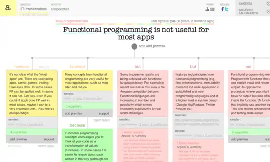 Some studies used or investigated excerpts of argumentations on the platform.[10][11] Unlike the larger and functional alternative Kialo, which is structured using only 'Pro' and 'Con' relations,[2] argüman arguments are structured by three types of premises – 'because', 'but', and 'however'.[3] As of the latest version, debates are presented in their entirety as a large tree which may be harder to navigate than other formats – for instance, trees "can become extremely dense, and the interface does not make it obvious which arguments the user should pay attention to".[2] Users can also flag arguments for fallacies. Arguman.org also had a Turkish-language subdomain.[12]