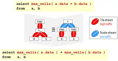 Due to the massive sizes of arrays in scientific/technical applications in combination with often complex queries, optimization plays a central role in making array queries efficient. Both hardware and software parallelization can be applied. An example for heuristic optimization is the rule "maximum value of an array resulting from the cell-wise addition of two input images is equivalent to adding the maximum values of each input array". By replacing the left-hand variant by the right-hand expression, costs shrink from three (costly) array traversals to two array traversals plus one (cheap) scalar operation (see Figure, which uses the SQL/MDA query standard).