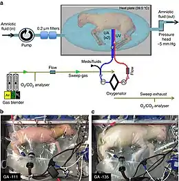 In 2017, researchers at the Children's Hospital of Philadelphia were able to further develop the extra-uterine system. The study uses fetal lambs which are then placed in a plastic bag filled with artificial amniotic fluid.[1][8] The system consist in 3 main components: a pumpless arteriovenous circuit, a closed sterile fluid environment and an umbilical vascular access. Regarding the pumpless arteriovenous circuit, the blood flow is driven exclusively by the fetal heart, combined with a very low resistance oxygenator to most closely mimic the normal fetal/placental circulation. The closed sterile fluid environment is important to ensure sterility. Scientists developed a technique for umbilical cord vessel cannulation that maintains a length of native umbilical cord (5–10 cm) between the cannula tips and the abdominal wall, to minimize decannulation events and the risk of mechanical obstruction.[23] The umbilical cord of the lambs are attached to a machine outside of the bag designed to act like a placenta and provide oxygen and nutrients and also remove any waste.[1][8] The researchers kept the machine "in a dark, warm room where researchers can play the sounds of the mother's heart for the lamb fetus."[8] The system succeeded in helping the premature lamb fetuses develop normally for a month.[8] Indeed, scientists have run 8 lambs with maintenance of stable levels of circuit flow equivalent to the normal flow to the placenta. Specifically, they have run 5 fetuses from 105 to 108 days of gestation for 25–28 days, and 3 fetuses from 115 to 120 days of gestation for 20–28 days. The longest runs were terminated at 28 days due to animal protocol limitations rather than any instability, suggesting that support of these early gestational animals could be maintained beyond 4 weeks.[23] Alan Flake, a fetal surgeon at the Children's Hospital of Philadelphia hopes to move testing to premature human fetuses, but this could take anywhere from three to five years to become a reality.[8] Flake, who led the study, calls the possibility of their technology recreating a full pregnancy a "pipe dream at this point" and does not personally intend to create the technology to do so.[8]