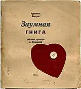 Key works such as Worldbackwards (1912), by Khlebnikov and Kruchenykh, Natalia Goncharova, Larionov Rogovin and Tatlin, Transrational Boog (1915) by Aliagrov and Kruchenykh & Olga Rozanova and Universal War (1916) by Kruchenykh used hand-written text, integrated with expressive lithographs and collage elements, creating small editions with dramatic differences between individual copies. Other titles experimented with materials such as wallpaper, printing methods including carbon copying and hectographs, and binding methods including the random sequencing of pages, ensuring no two books would have the same contextual meaning.[11]