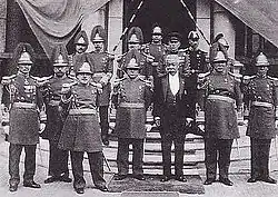 An important factor that allowed for the expansion of the Manchukuoan army was conscription. The Military Supplies Requisition Law of 13 May 1937 allowed the Manchukuoan and Japanese armies to conscript laborers, as well as allowing them to appropriate land and materials for the purposes of keeping order.[3] The draft of soldiers did not begin until April 1940 and was not officially signed into law until 1941, which allowed every able-bodied male between the ages of eighteen and forty to be called up, of all ethnic groups. All youths were required to get a physical and then 10% of them were selected for service. Education, physical fitness, and their families' loyalty to the regime were things taken into consideration for selecting conscripts. When this was not enough, the Japanese forcibly drafted males from across the country into the army, and many efforts were taken to foster a Manchukuoan patriotic spirit among the troops.[4][5]